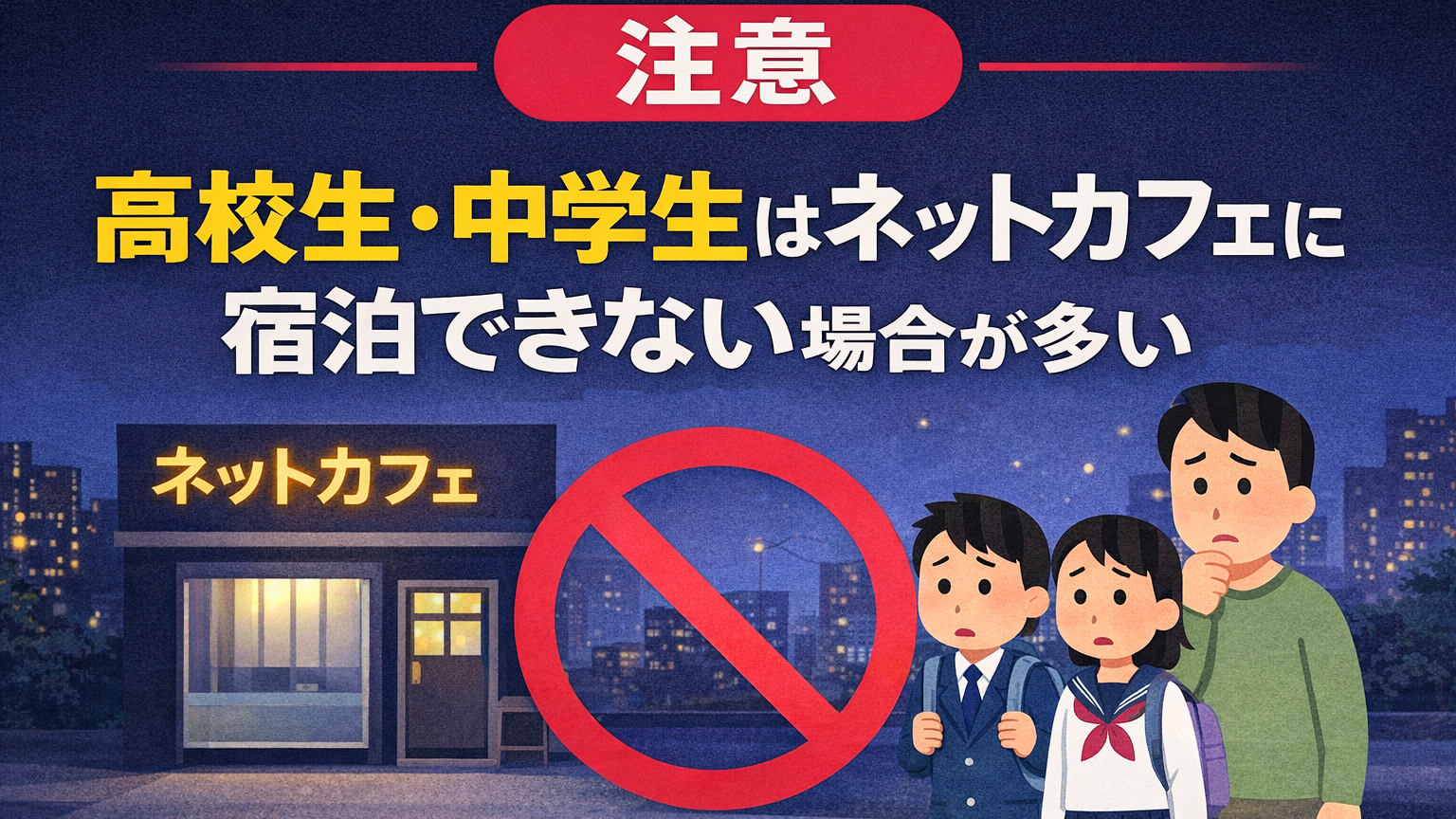 そのため、高校生や中学生が宿泊場所としてネットカフェを利用しようとしても、夜間は入店できなかったり、途中で退店を求められたりする可能性があります。