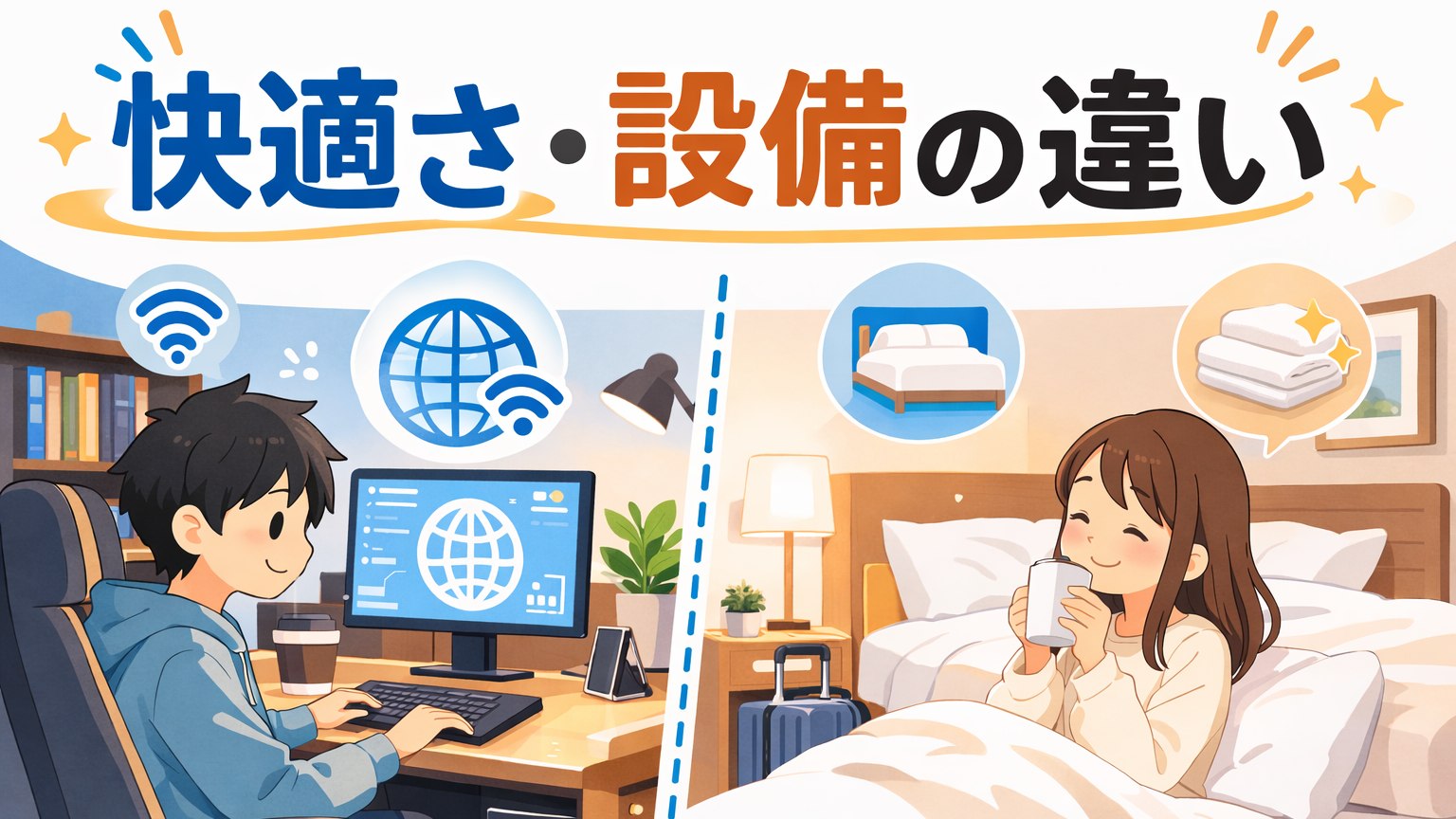 ネットカフェとホテルはどちらも一時的に滞在できる施設ですが、目的や設備には大きな違いがあります。