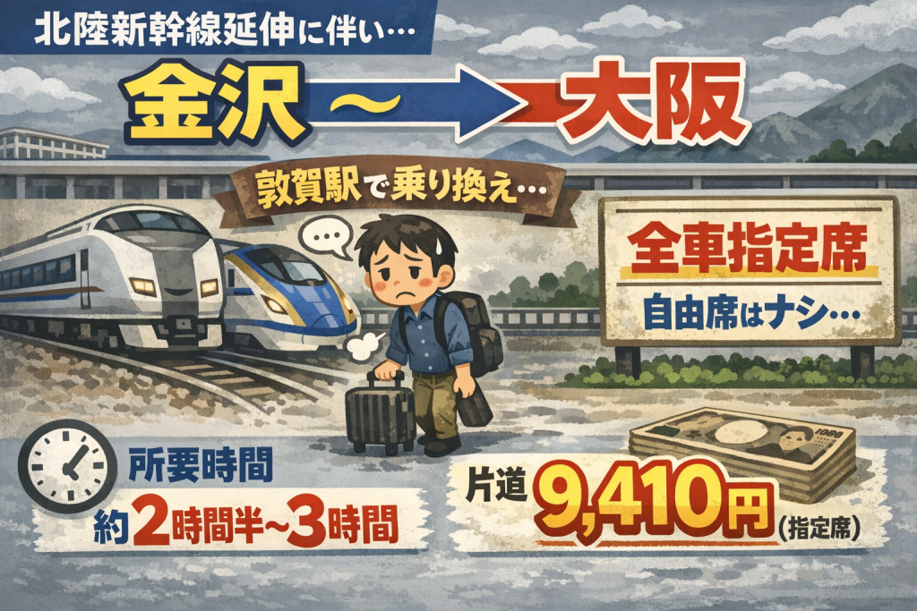 金沢から大阪に行くためには、サンダーバードに乗るため敦賀駅まで行く必要があってそれも正直めんどくさいです…。