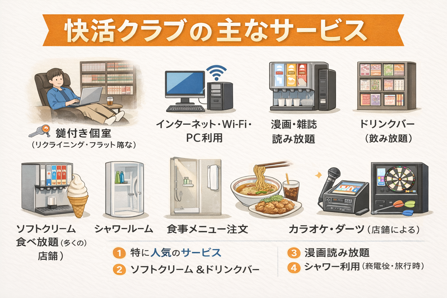 多くの店舗ではWi-Fiや電源も完備され、静かな個室空間で快適に過ごせます。料金は時間制で、数百円から利用可能。長時間パックほど安くなる仕組みが一般的です。終電後の滞在や作業、時間つぶしなど、幅広い用途で使える便利な施設として人気があります。