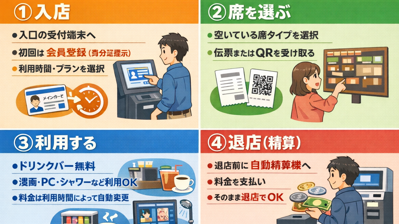 利用の流れは、来店後に会員登録を行い、身分証を提示して席タイプとパックを選択するだけ。