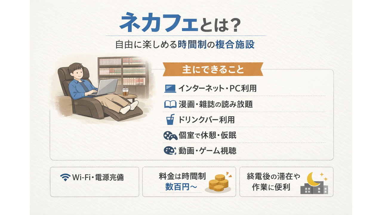 ネカフェ(ネットカフェ)とは、パソコンや漫画、動画などを楽しめる時間制の複合施設です。現在では休憩や作業、簡易宿泊の場所としても利用されています。